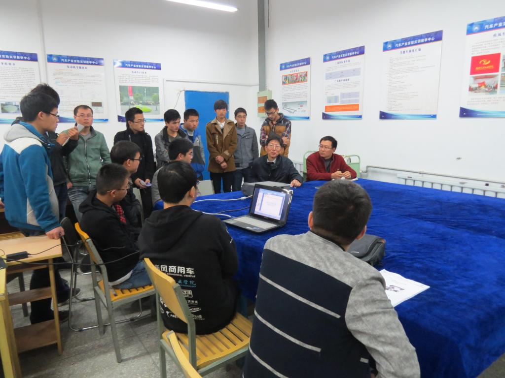 兼职教授,东风汽车公司技术中心副总工程师范幼清高工在2014赛季车队指导老师邓召文和上届队长余晓伟的陪同下,应邀来到东风HUAT车队,先后参观了车队技术工作间、展览区和队员工作室,并听取了HUAT车队2014年度HUATⅣ赛车设计、管理等方面报告。