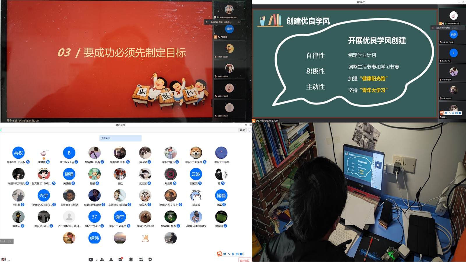 要求并结合班级实际情况,讲述优良学风建设要点;他们对当前学生学习情况进行分析,鼓励学生制定学习计划,强调学习方法、端正学习态度、注意听课习惯等方面内容。随后,在健康与安全的教育板块,老师们积极宣传新冠疫情的防护知识,做好疫情后的心理调适,并强调要坚持健康打卡;最后以短视频等多种形式向学生们介绍了当前国家安全形势,帮助同学们树立国家安全意识。在周日“晚点名”活动上,车辆194班优秀学长漆肖以“微团课”的形式向21级学生分享了学业规划的有关经验。