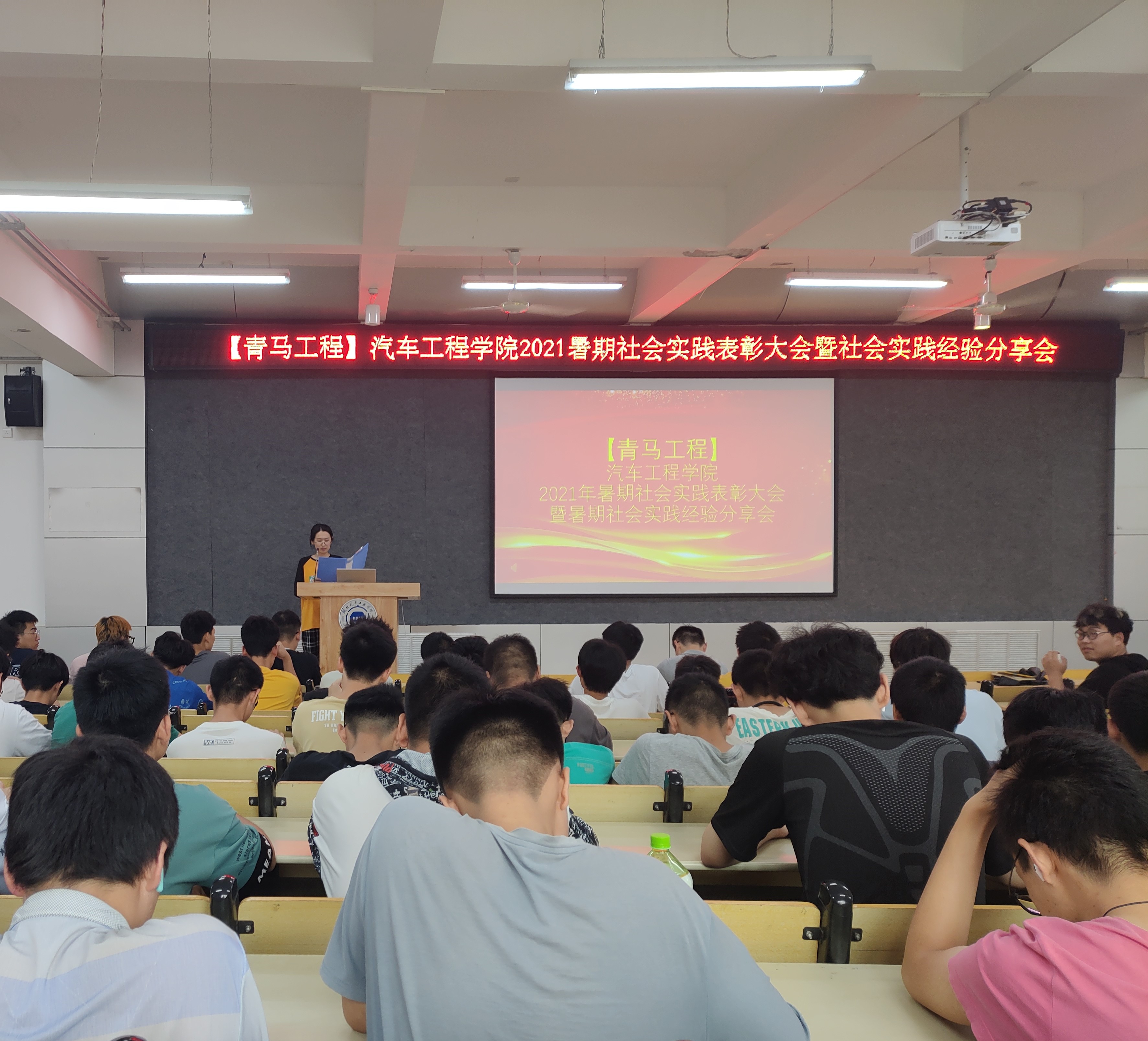 车辆203班刘伯通作为暑期社会实践优秀代表上台分享实践经验,他从社会实践的选题、策划、调研、实施、意义等几个方面向全体参会同学进行了细致讲解与分享。他建议选题时从身边事迹考虑,在实践过程中注意照片的拍摄,同时也要注意投稿的时间、数量、质量。
