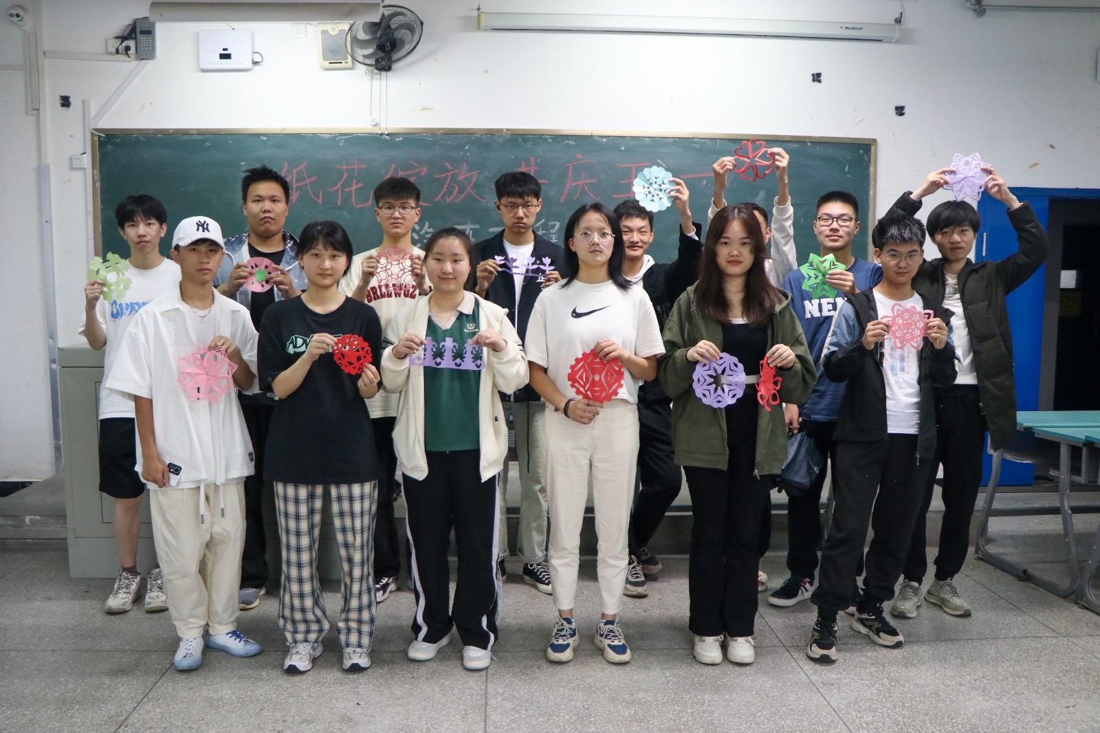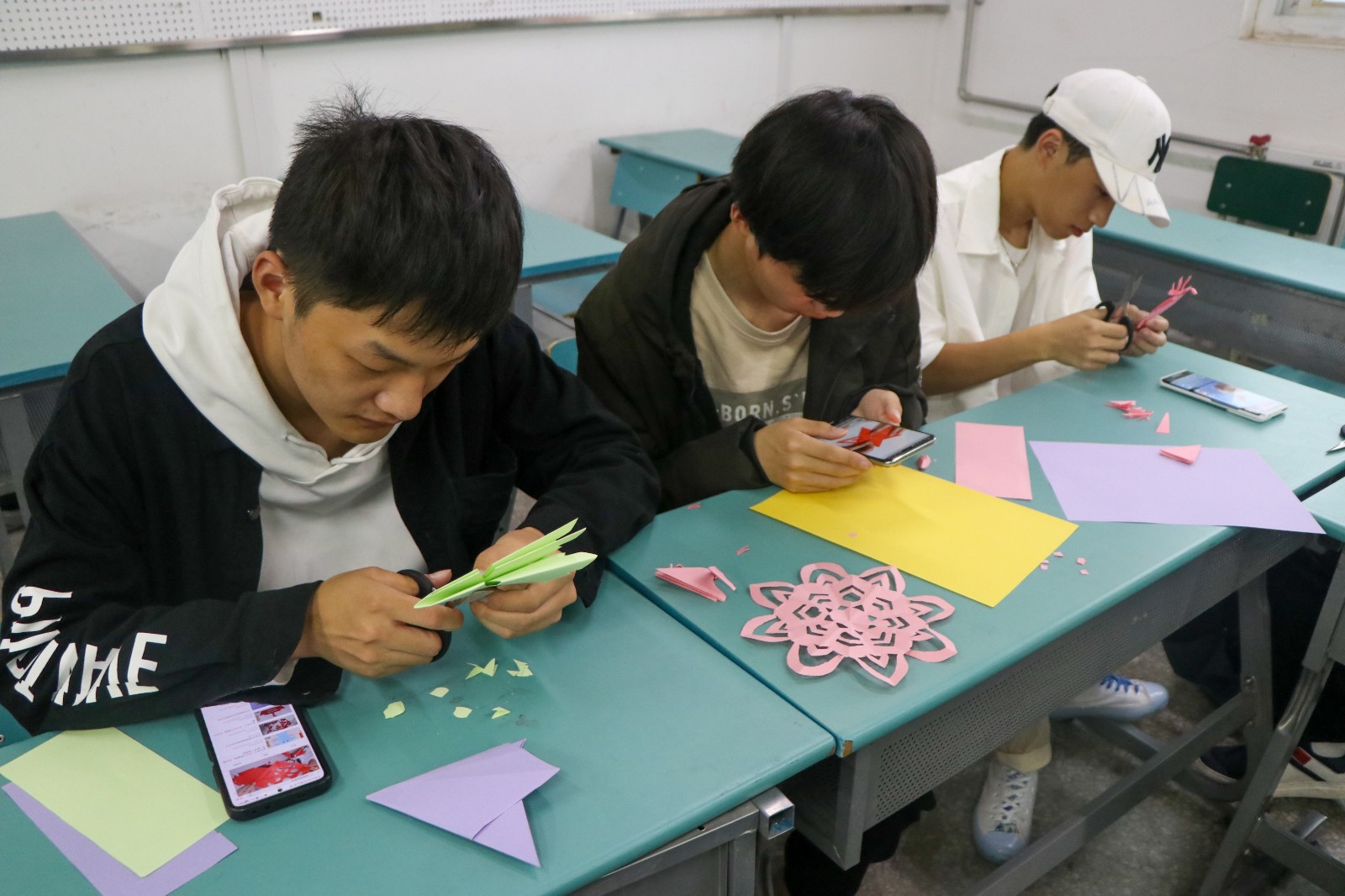 分团委在6512教室举办了“纸花绽放,共庆五一”剪纸活动。