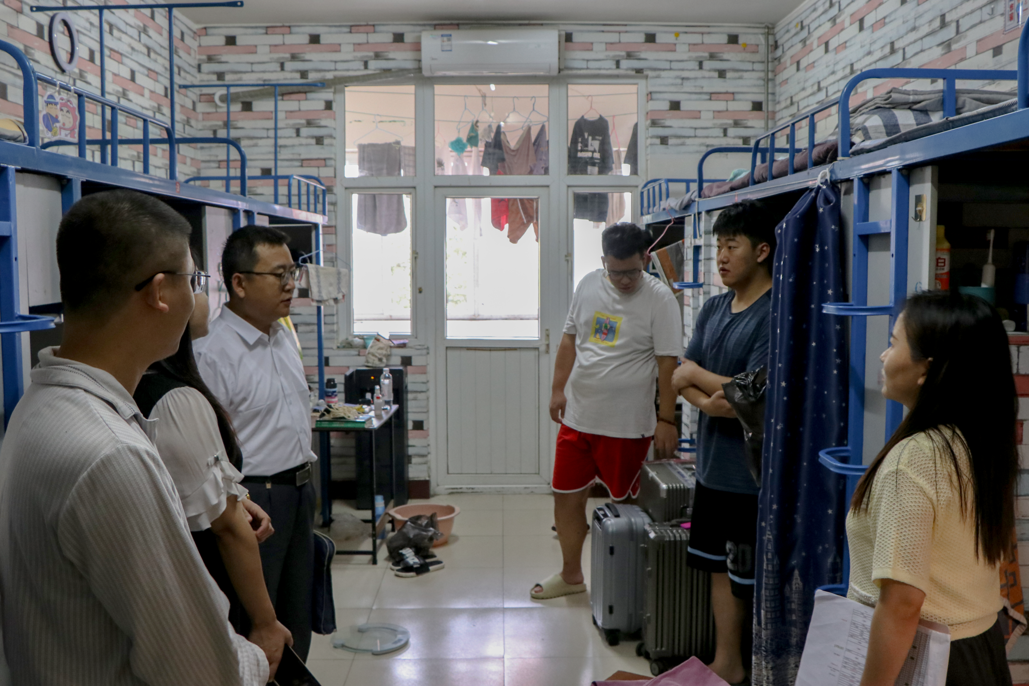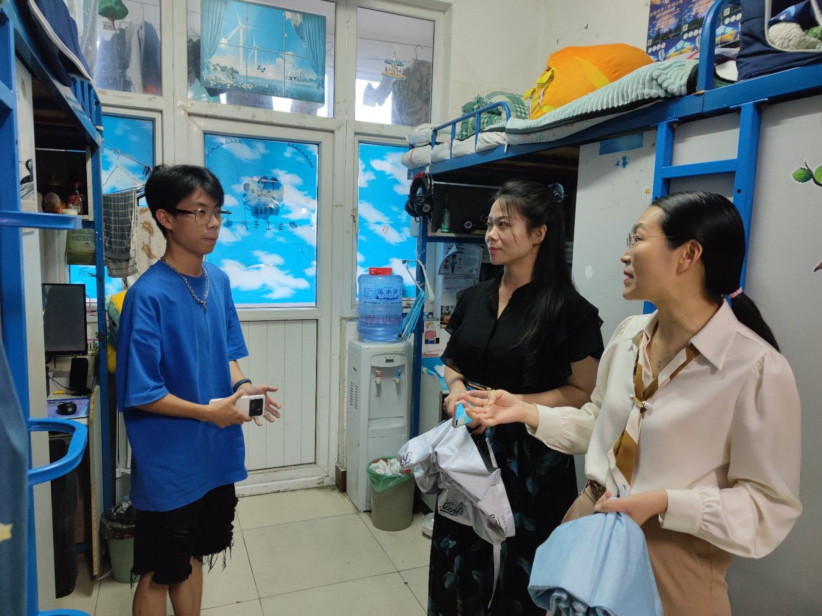 副书记周彬及辅导员李旭、甘甜等人前往李四、桃三、桃一留校学生及车队学生。每到一处,杜昕俊都叮嘱同学们,注意关注防范恶劣天气,出行注意安全,非必要不外出,并提醒同学们在努力学习的同时要注意补充营养、防暑降温。