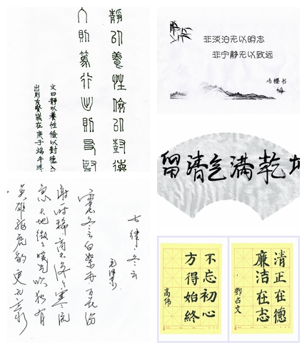 分团委书记胡宵寒以毛笔书写“只留清气满乾坤”,以墨梅气节表达廉者情怀;党委委员韩同群以一幅毛泽东同志的《七律.冬云》表达了对中国人民抗疫必胜的信心;副教授郭一鸣以宋濂的《拟古》表达了“政以廉洁故”的核心理想;邓召文、高伟分别以“不忘初心、方得始终”、“清正在德、廉洁在志”表达了夫妇二人为师树德的信念;副教授吴胜军以“栉风沐雨做园丁、热血丹心育桃李”向党的99周岁生日献礼;能源与动力工程系主任程婷婷用精美纸张书写入党誓词,进行了一次书面的重温誓词;副书记李秀峰以诸葛亮《诫子书》以自勉;学生支部书记李雅琨以一幅娟丽的《爱莲说》诠释了廉与美的内涵;二支部书记樊继东《石灰吟》、《咏史》、《咏煤炭》三首古诗一气呵成,借物喻志;新进博士王东雄工整书写《廉洁如花》散文一首,表达了工科教师内心廉者情怀。此外还有赵慧勇、杨润泽、周吉伟、覃玄、朱政、章菊等党员同志也都以自己独特的视角提交了作品,在一笔一划、回旋勾勒中表达了廉心廉志。