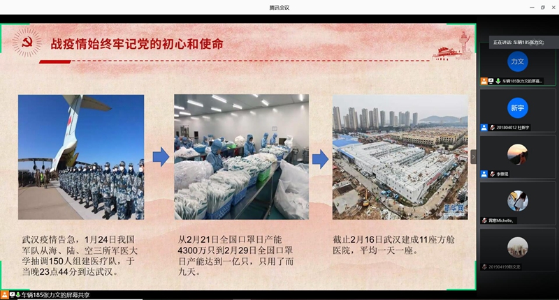 于7月5日晚7:30在腾讯会议平台举办了“知党恩·跟党走”建党99周年主题团课活动,分团委书记胡霄寒、学生党支部书记李雅琨以及19级全体同学参加了此次活动。