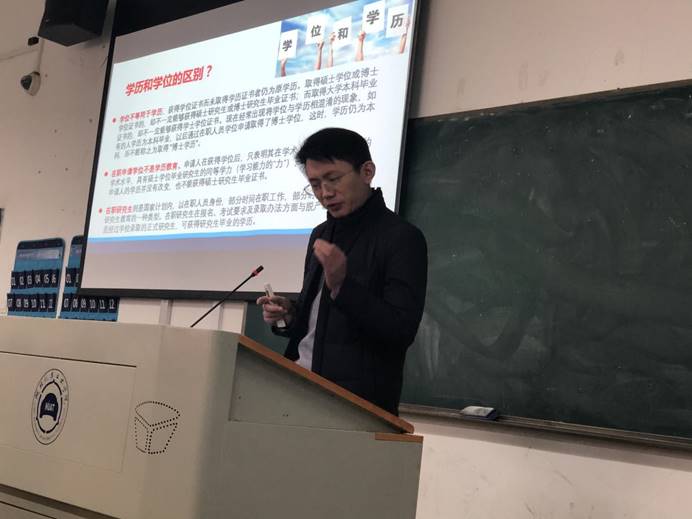 老师与17级同学的浓厚师生情谊,引得现场一片热烈的掌声和笑声。随后他从学历学位常识、大学分类、台湾成人片