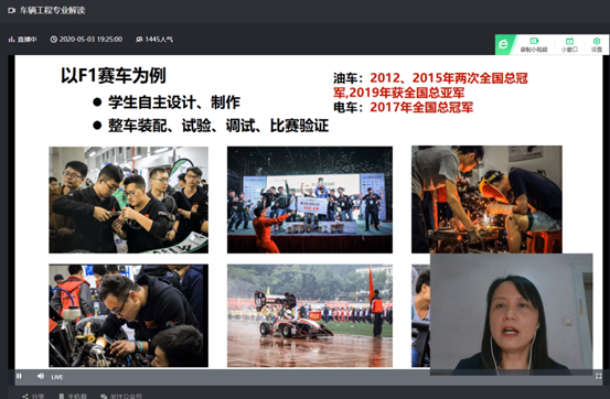 车辆工程的“国家一流专业”、“通过工程教育专业认证”、“卓越工程师的摇篮”、“F1赛车国内顶尖”等特色,详细介绍了车辆工程专业优良的发展前景、火爆的市场需求、良好的专业发展进程、雄厚的师资力量以及先进的科研平台等多方面内容。清晰的脉络、详实的内容,受到了考生及家长的一致好评。最后答疑环节,对于“车辆工程专业新能源方向”、“新的经济形势下汽车行业未来”等一些代表性问题进行了回答, 增强了考生和家长对选择车辆工程专业的信心。在直播期间,学工部曾又、吴媛媛、明瑞雪,台湾成人片