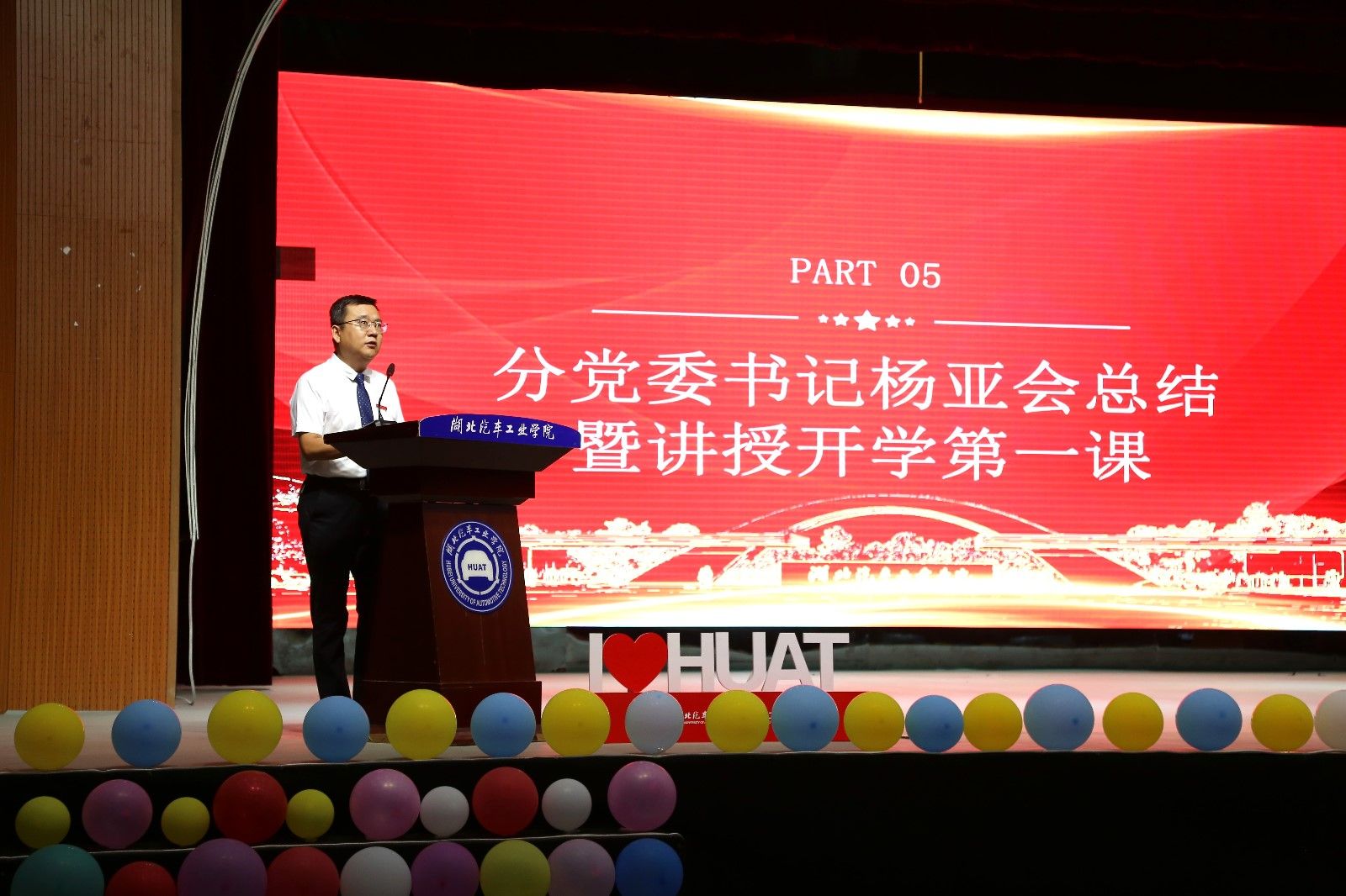 全体在校班子成员、系主任、本科专业负责人、新生班主任及全体辅导员共同出席大会。分党委书记杨亚会以“青春正逢盛世 奋斗恰当其时”为题,为全体新生讲授“开学第一课”。