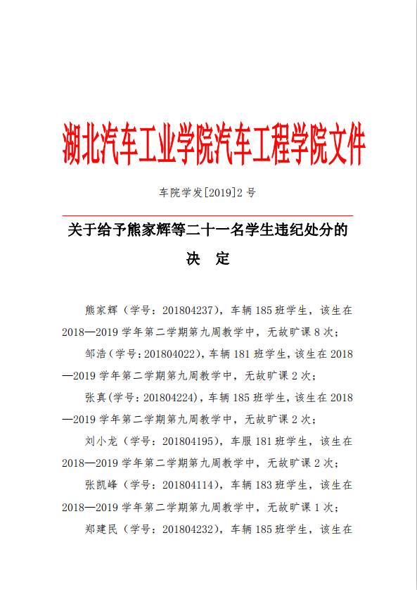 关于给予熊家辉等二十一名学生违纪处分的决定