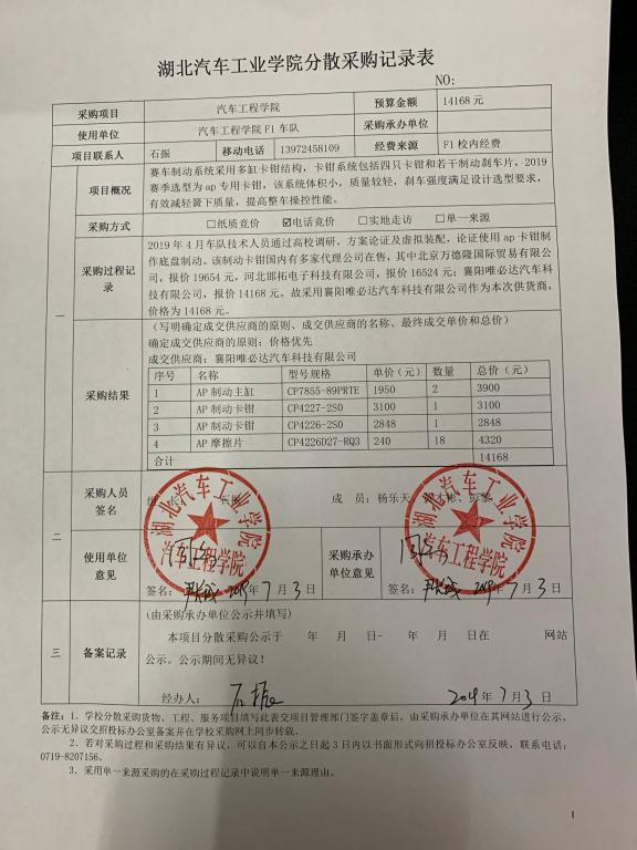F1车队分散采购记录表(AP制动卡钳)