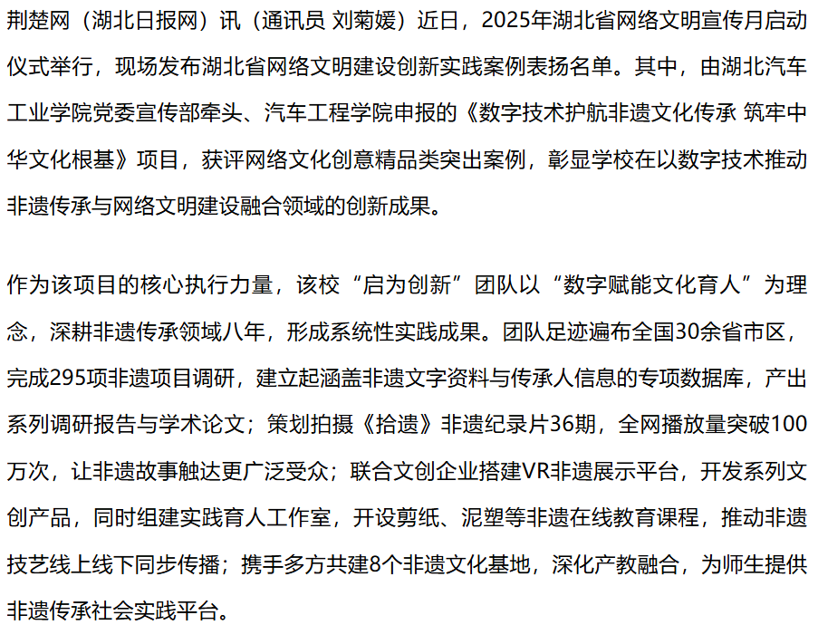 【荆楚网】数字护航非遗!台湾成人片 项目入选省级网络文明建设创新案例