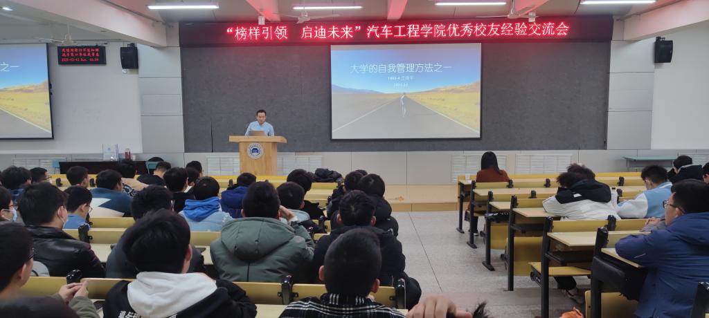 与德国乌尔姆应用科技大学的本科双学位交换项目;本科毕业后继续在乌尔姆应用科技大学攻读研究生;其目前在奥迪中国企业管理有限公司从事电子电气规划和诊断相关的工作。王维平首先结合自己在大学时的困惑向大家提出了中肯的建议;随后,王维平结合自身的大学成长经历,与大家分享了“PDCA自我管理方法”与职业生涯规划的感悟。“同学们要立志成为兼具宽口径知识储备与专业技能过硬的T型人才,在大学四年里着重培养锻炼自身的汇报表达能力、项目管理能力、前瞻性思考能力等素质。”