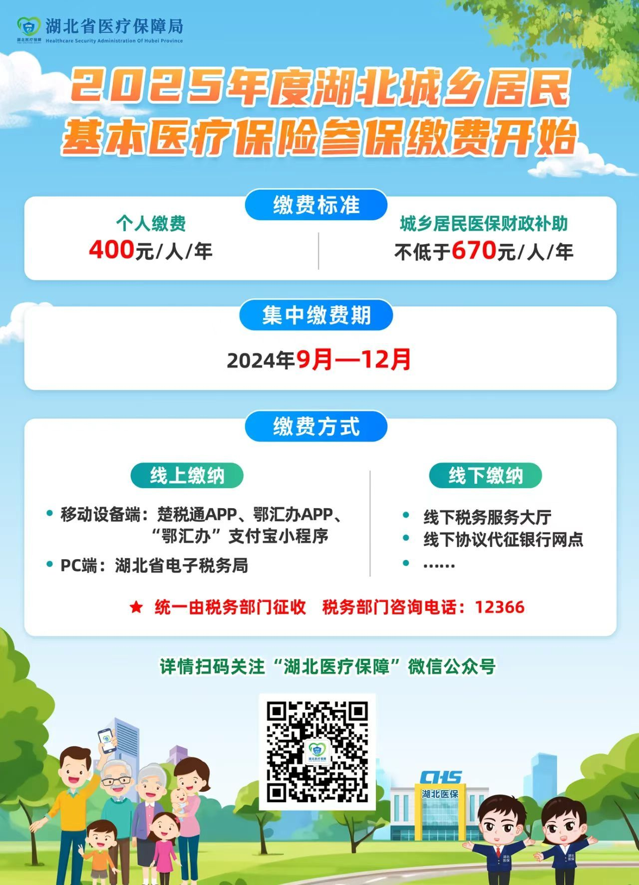 (1)2025年度城乡居民基本医疗保险集中参保缴费时间2024年9月-12月,保险费用一年一缴,保障时间为2025年1月1日-12月31日,入学新生办理完参保登记后可自行在湖北医疗保障微信小程序、鄂汇办APP等渠道缴纳2025年城乡居民基本医疗保险。2025年城乡居民医保个人缴费标准为400元/人每年,具体操作流程可参考微信公众号“湖北医疗保障”推文《@湖北人,城乡居民医保缴费开始啦》;